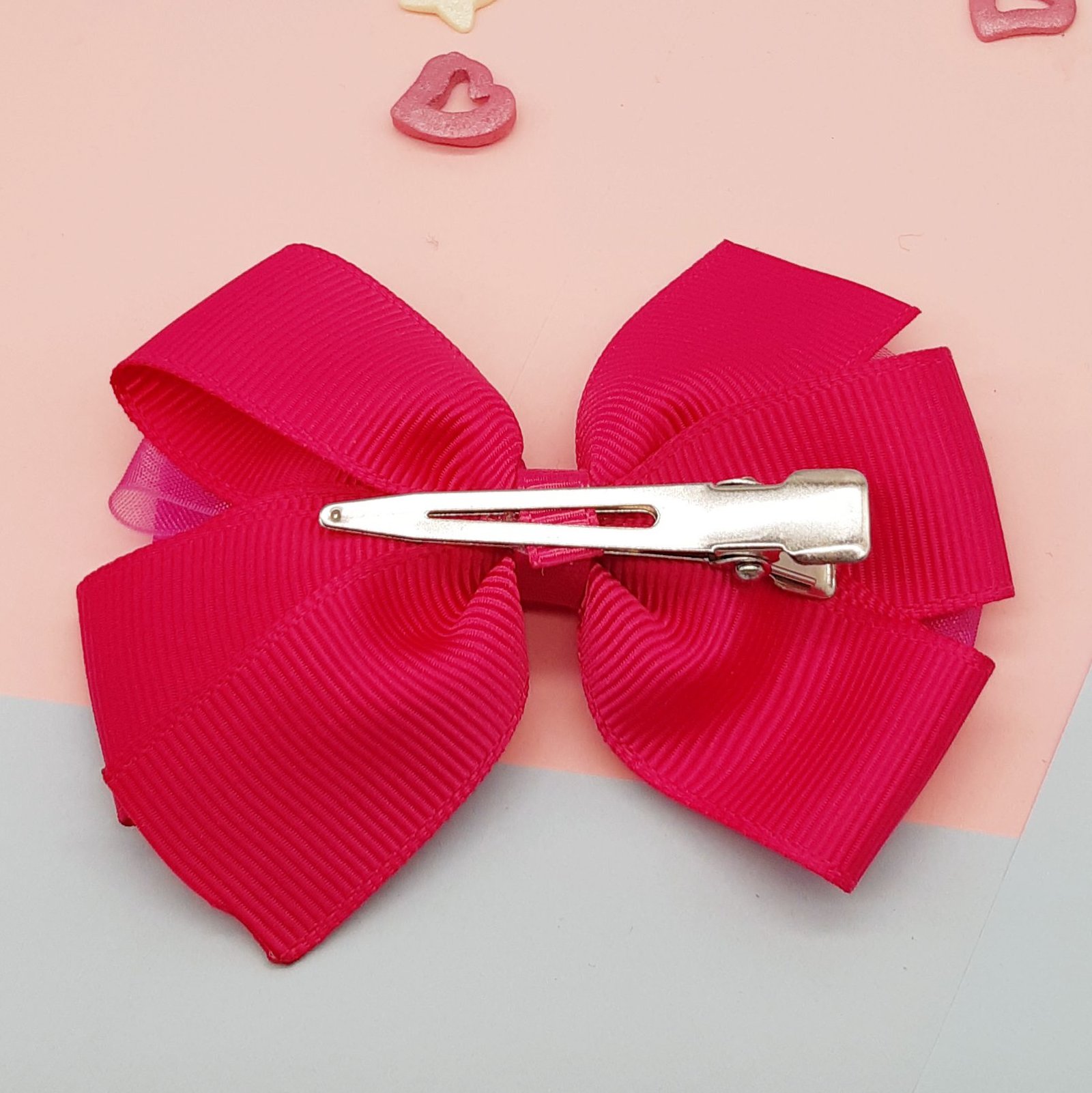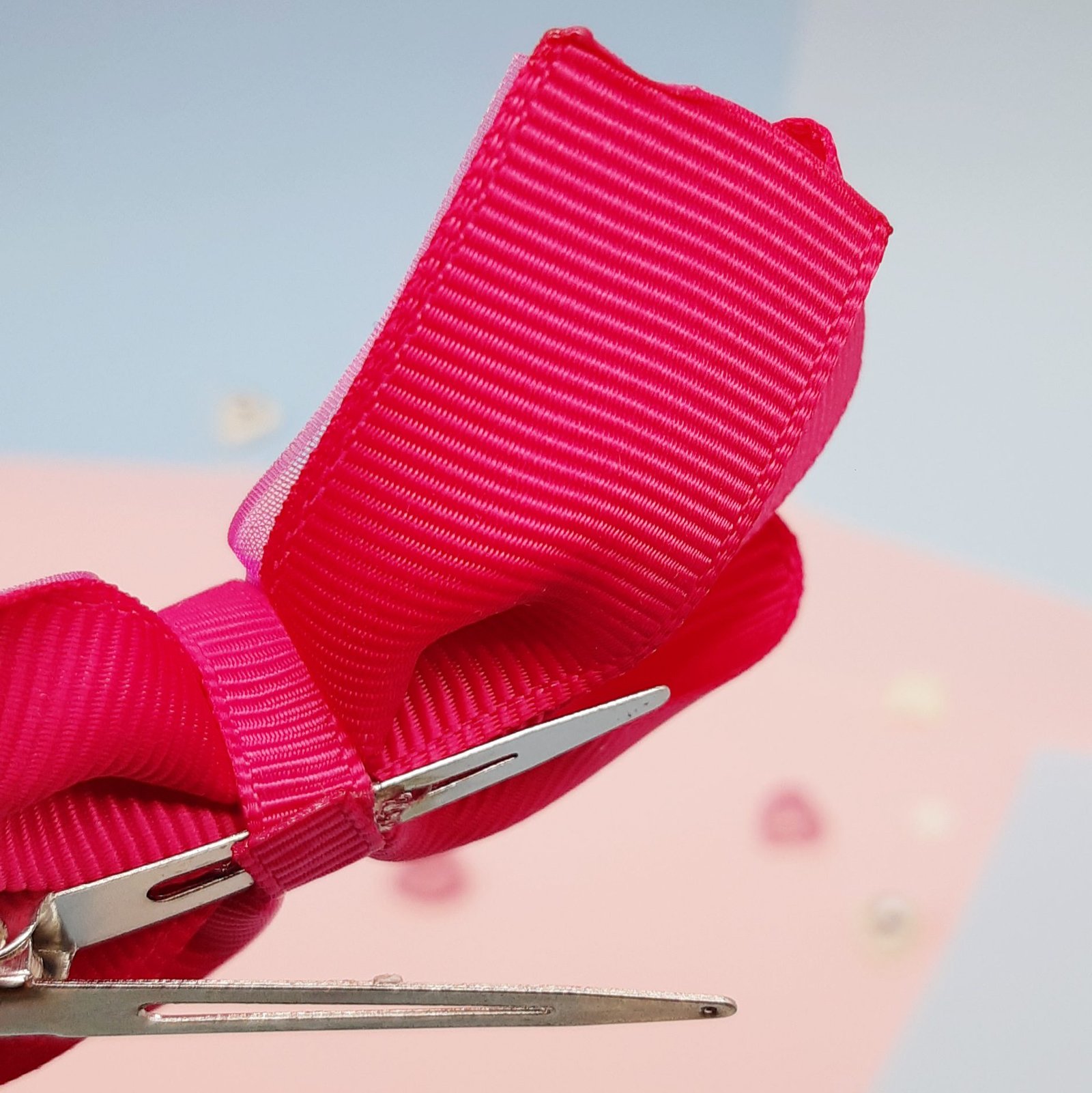 Rankų darbo rožiniai segtuka su organzai. Du vienetai. Užsegimas aligatorius (lygus, be dantukų, 4,5 cm ilgio). Segtuko kaspinuko ilgis apie 7,5 cm.