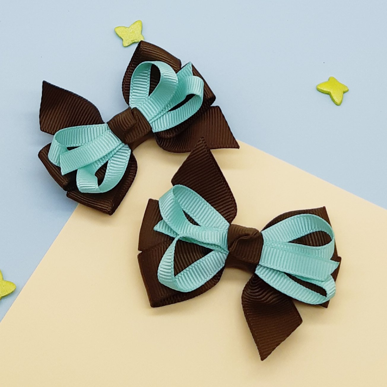 Rankų darbo plaukų segtukai kaspinukai. Du vienetai. Užsegimas aligatorius (be dantukų, 4, 5 cm ilgio). Segtuko kaspinėlio ilgis apie 6,50 cm. Kaspinukai labai gražūs, žaismingi. Nuostabiai atrodo mergaitės plaukuose.